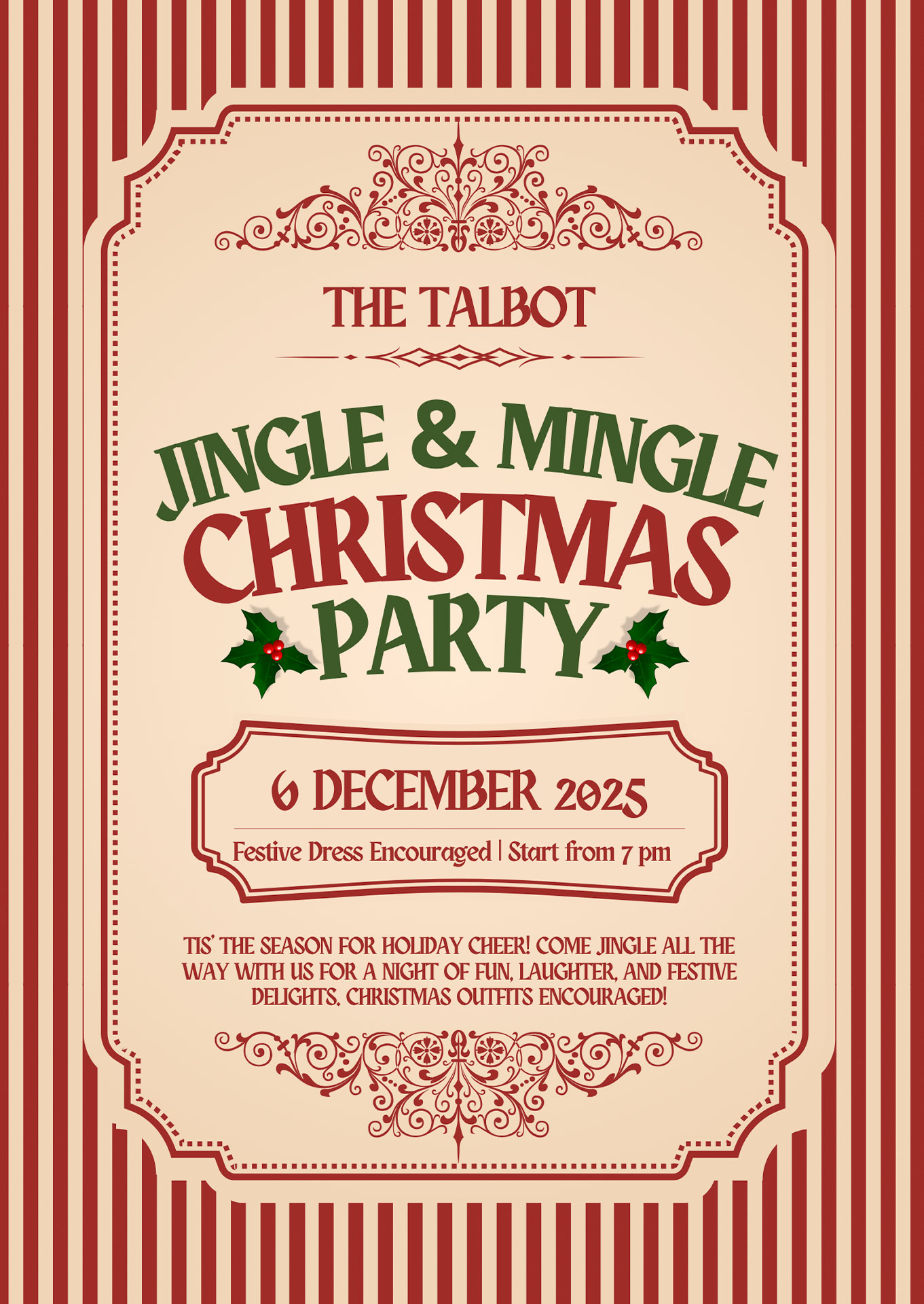Get ready to celebrate the festive season in style at The Talbot’s Jingle & Mingle Christmas Party! Gather your friends, family, or colleagues for an evening filled with holiday cheer, music, and merriment.