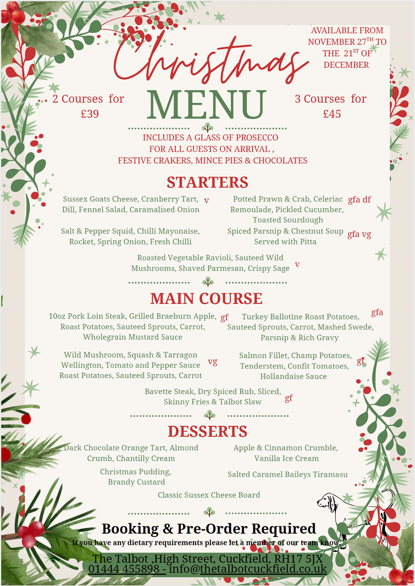 There is no better place to celebrate Christmas this year with friends, family and colleagues. Head Chef Giuseppe Filocamo has created the ideal menu which is available –from Thursday 27th November till Saturday 21st December, inclusive. The menu includes a Glass of Prosecco on arrival for all guests, Cocktail Mince Pies, Chocolates (Roses of course) and Crackers. The menu is available for Lunch and Dinner throughout the week (excluding Sunday evening) the Talbot is the perfect setting for that small family celebration or to enjoy with work colleagues…